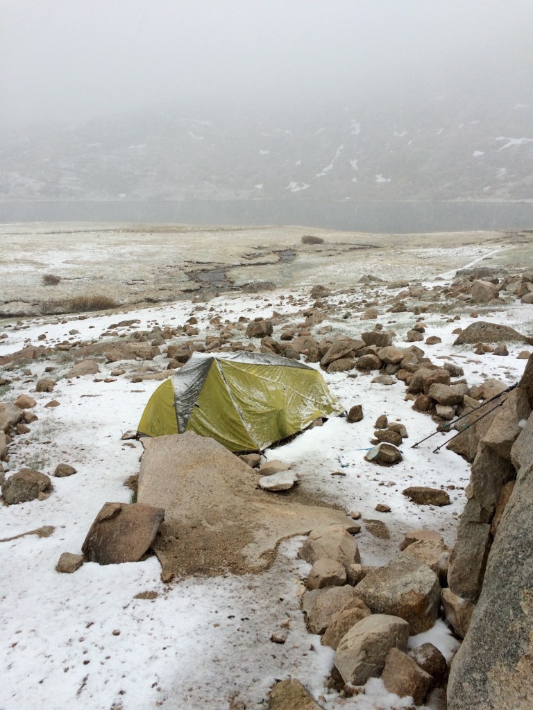 Mt. Whitney, the highest peak in the contiguous U.S., at 14,505 feet, is in this stretch. It’s not part of the PCT, but most hikers do this popular side trail. Our plan was to camp a few miles up the trail, then summit in the morning. But of course, plans are made to be broken (especially on the PCT). We hiked to our planned camping spot, on Guitar Lake, in the snow with a little bit of thunder. We set up our tent in record time!