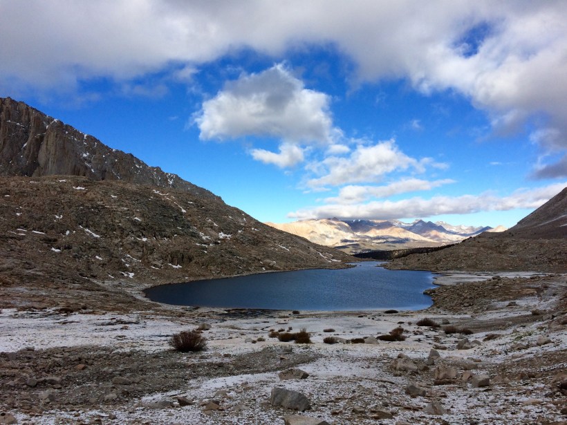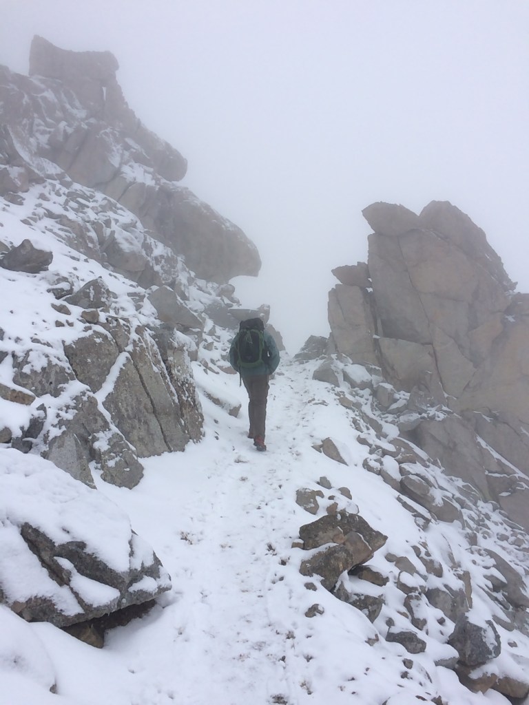 The next morning, it had stopped snowing, much of it had even melted. There was patches of sunlight hitting the peaks, unfortunately not the peak we wanted to climb. Whitney was shrouded in clouds, but we decided to give it a go anyway. The hike up to the clouds was some of the most beautiful scenery I’d ever seen. Then we hit clouds, and snow, coupled with elevation, very slow climbing. We made it up to the ridge crest, only another 1.9 miles to summit, but the trail was getting a bit treacherous with the new and old snow.